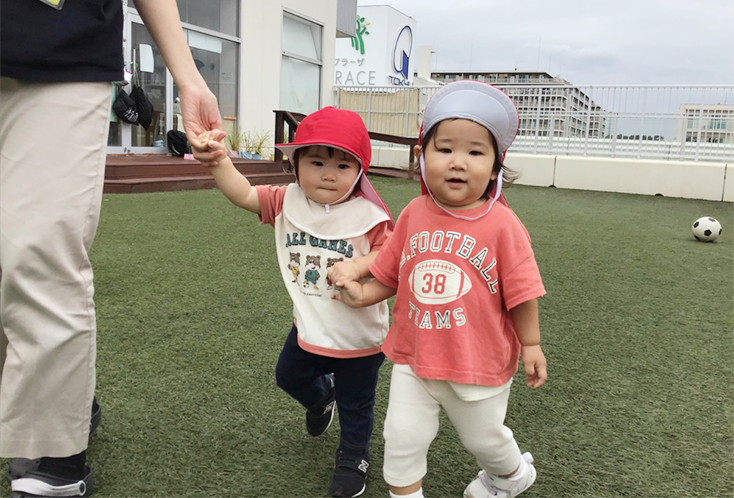 園庭で遊んでいる0歳児さん。お友だちと手をつないで歩いたよ♪