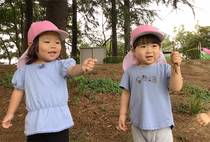 お散歩に出掛けた1歳児さん。木の枝を見つけたよと見せてくれました☆