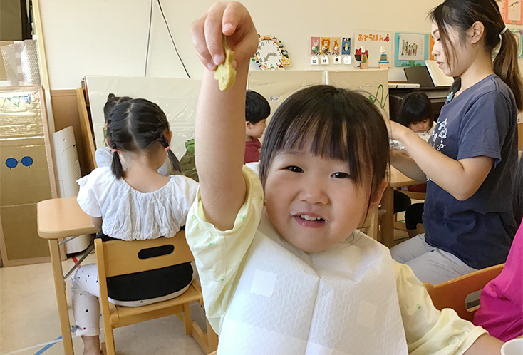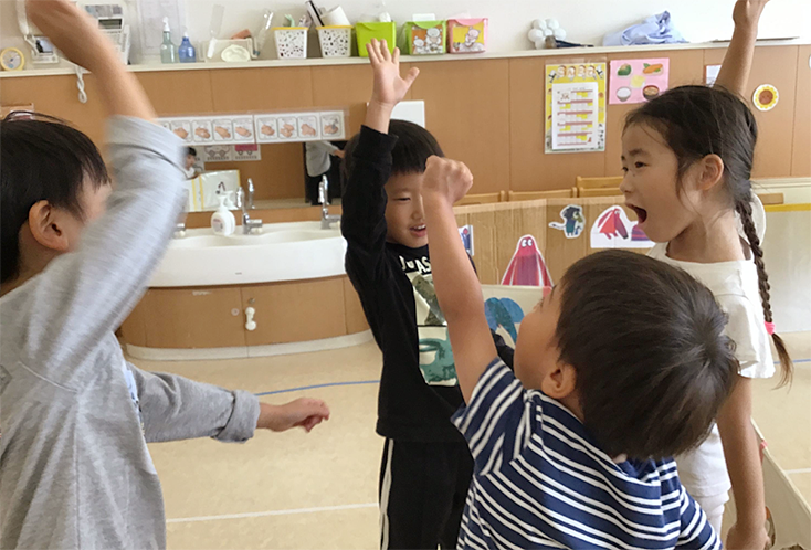 お部屋で遊んでいる4歳児さん。頑張るぞ!と皆で気合いを入れました☆