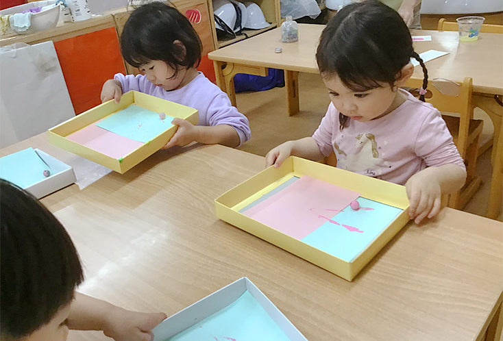 ビー玉コロコロ、画用紙に色をつけて、何が出来るかはお楽しみ♪