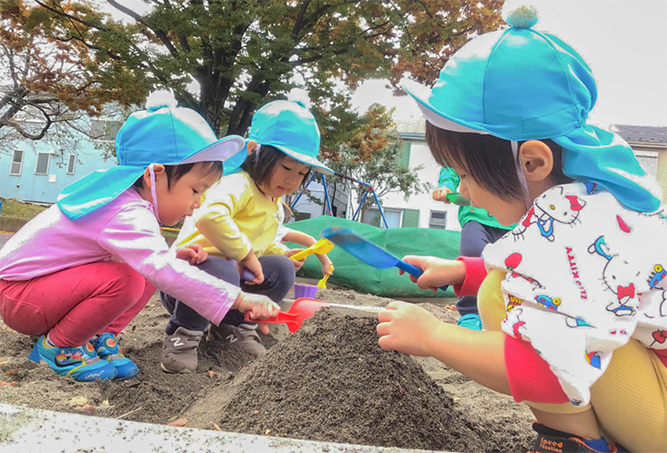 砂場で山作りをしました。手で砂を集めて「よいしょ」と山を作ったよ~。