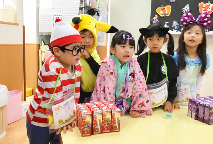 仮装して「いらっしゃいませー」秋祭りでジュースを売りました。