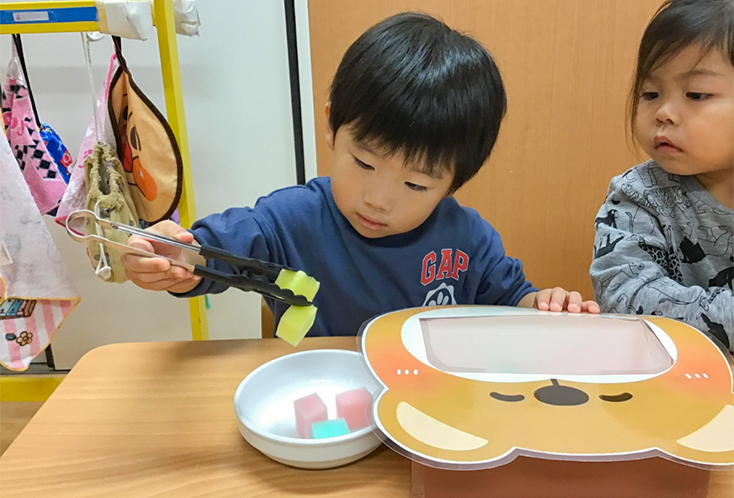 給食の先生と一緒に食育☆トングを上手に使ってお口へ…ぱくっ!